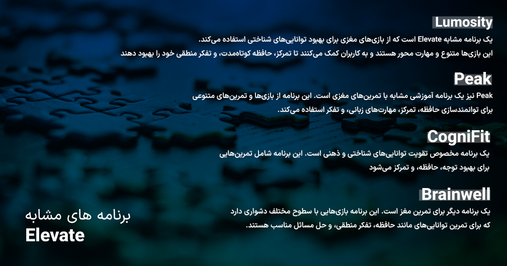 برنامه “Elevate” شامل تمرینهایی مانند حل مسائل ریاضی، بهبود حافظه، تمرکز و توجه، تشخیص خطا و بهبود تفکر منطقی است. با استفاده از اکانت “Elevate”، کاربران میتوانند پیشرفت خود را با دوستان و خانواده به اشتراک بگذارند و از وضعیت پیشرفت خود در جامعه “Elevate” مطلع شوند.