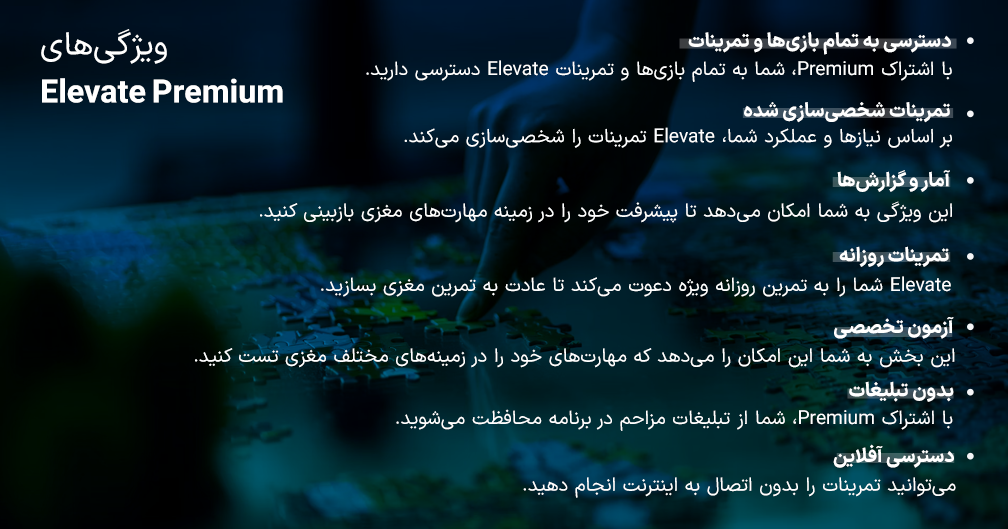 خرید اکانت Elevate شامل دسترسی به بیش از 40 بازی تمرینی و بیش از 1000 تمرین مختلف مغزی است. با استفاده از این برنامه شما میتوانید به تمرین های متنوعی بپردازید که شامل بازیهای پازلی، سرعت خواندن، حساب کردن و غیره میشوند. این تمرینات به شما کمک میکنند تا مهارتهای خود در زمینه تفکر، تمرکز و حل مسائل را بهبود بخشید.
